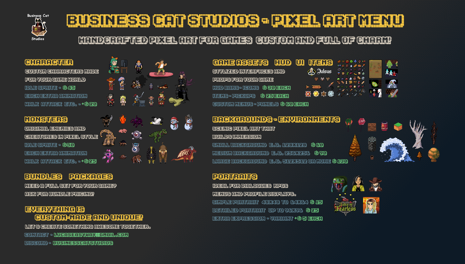 Congrats on the fantastic work you’ve shared here! Your project stand out for their creativity and polish. At Business Cat Studios, we specialize in custom pixel art assets—characters, environments, UI, and more—designed to elevate any game. We’d love to collaborate on your next adventure! Feel free to reach out.